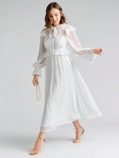 Romantic Fall Holiday White Elegant Long Sleeve Ruffle Hem Midi Casual Dress