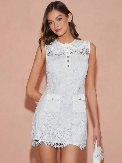 Autumn/Winter Romantic Women's White Floral Embroidery Lace Exquisite Rhinestone Decor Bowknot Sleeveless Mini Dress,Elegant&Sweet&Cute For Thanksgiving&Christmas Party&Pretty Date Nights&Romantic Dinner Dates&Garden Parties-32%
