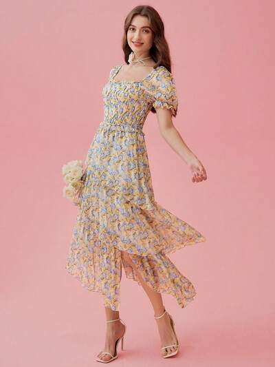 Women's Elegant Summer Asymmetric Hem Dress With Ditsy Floral Print-23%