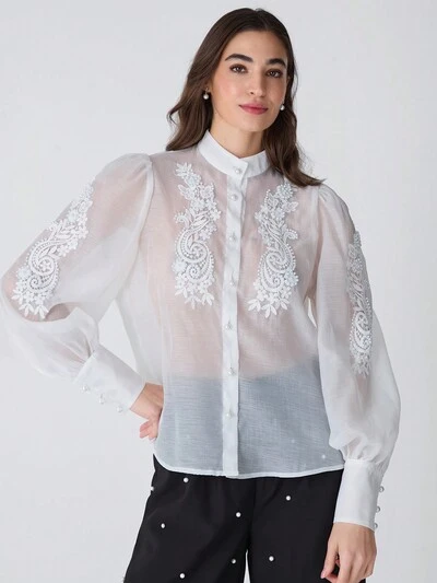 Winter Romantic Women's Elegant Floral Lace Bubble Beads Decoration Long Sleeve Elegant Blouse, For Christmas Party&Romantic Dinner Dates-60%