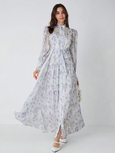 New Winter Products,Romantic Holiday Women's Floral Print Stand Collar Belted Button-Front Long Sleeve Dress, New Years Dress ,Winter Outfits,Elegant Women Dresses,Holiday Dress,For Christmas Party&Romantic Dinner Dates-60%